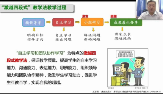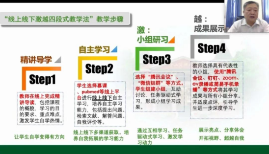 王教授介绍,“激越四段式教学法”是在“以团队学习为基础的(Team-Based Learning,TBL)教学模式”的基础上,结合我国医学教育特点和校情实际,改革发展而来的一种创新教法,是开展特色教学促使学习小组之间碰撞出新的思想火花。他为我们详细讲解了基于疫情防控背景下,开展“线上线下激越四段式教学法”的教学步骤: