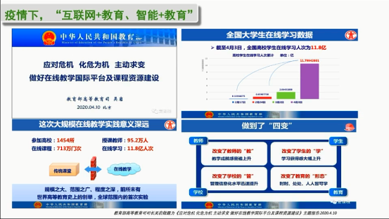 直播开始王庭槐教授首先介绍分享了疫情期间教育部高等教育司统计发布的线上教学数据及教育司司长吴岩的讲话——“要加快在线教学由‘新鲜感’向‘新常态’的转变”,“‘四性五度’:推动高等教育的‘质量革命’”。