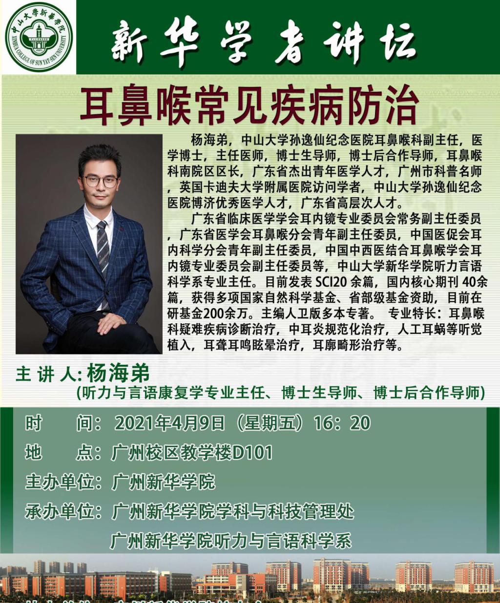 杨海弟,中山大学孙逸仙纪念医院耳鼻喉科副主任,主任医师,博士生导师,耳鼻喉科南院区区长,广东省杰出青年医学人才,广州市科普名师,英国卡迪夫大学附属医院访问学者,中山大学孙逸仙纪念医院博济优秀医学人才,广东省高层次人才。