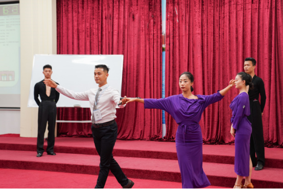 来自体育系的张旭老师在比赛现场教授的是伦巴舞与滑门步。张旭老师通过课堂前复习,课中讲解练习:分解本节课的舞步、加强学生们的步序练习、指出现场学生们在学习中的典型错误,为学生们布置课后思考题,加深学生们对教学内容的理解。