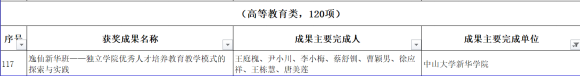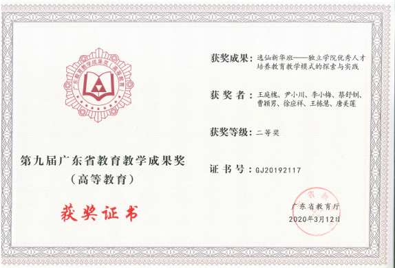 根据广东省教育厅公布的《广东省教育厅关于公布2019年广东省教育教学成果奖获奖项目的通知》(粤教人函〔2020〕6号),我校王庭槐校长牵头,尹小川、李小梅、蔡舒钏、曹颖男、徐应祥、王栋慧、唐美莲参与完成的《逸仙新华班——独立学院优秀人才教育教学模式探索与实践》获得了广东省高等教育教学成果奖二等奖,实现了我校省级教学成果奖“零”的突破!