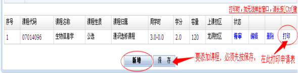 6.填写好相关信息后,务必点击保存。如果要申报多门课程,则点击“增加”;如果同一门课程要申请不同时间上课,请选择好“上课时间”后直接点击保存即可。