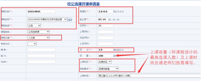 5.填写注意事项:如下表所示,红色框框的信息都必须要填写。【起止周】一律填“03-14”;【周学时】填写:3.0-0.0(3节/周);【课程类别】一律填写:公共选修;【课程归属】请填写四大模块中的一类:通识选修课程、专业公选、应用技能、创意创新创业;【禁选对象】为禁止选课的学生,对选课学生有要求的教师,请务必认真填写该项信息;【课程简介】和【申请说明】必须填写;有教材的直接填写即可。