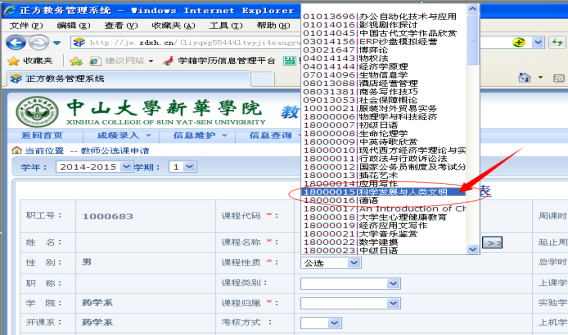4.在下拉框中选择所要申报的课程。(如果没有所要申报的课程,请联系教务处吴老师0769-82676824)。
