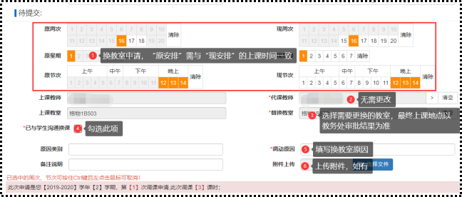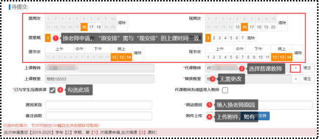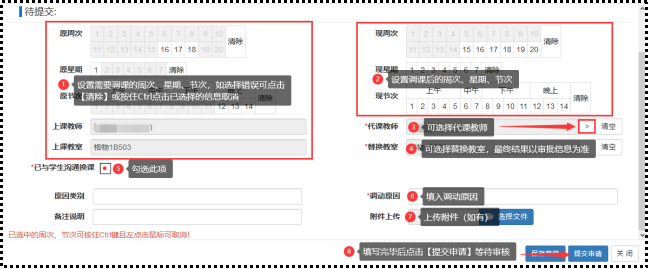 3.下方“待提交”处设置调课前的“原安排”及调课后的“现安排”。