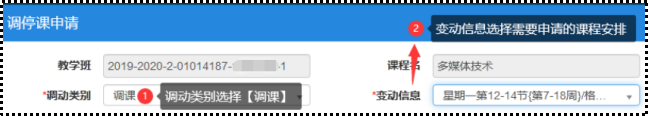 2.“调动类别”选择【调课】,“变动信息”选择具体的课程安排信息。