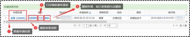 4.提交申请后返回“调停课申请”页面,可查看已提交的申请记录,以及进行相应操作。