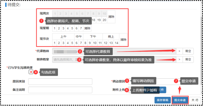 3.下方“待提交”处设置补课的周次、星期、节次信息。