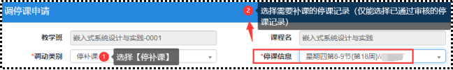 ※“停补课”功能与“停课”功能搭配使用,即对已申请并审核通过的停课记录进行补课。