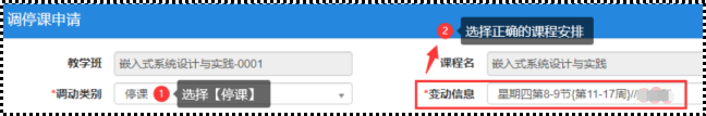 2.“调动类别”选择【停课】,“变动信息”选择具体的课程安排信息。