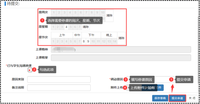 3.下方“待提交”处设置需要停课的周次、星期、节次信息。