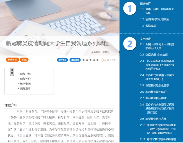 为引导学生在封闭管理期间养成健康的生活方式,缓解心理压力,传播正能量,教务处结合已有的日常教学安排,制定了《关于开设心理、美育、音乐等通识教育课程的实施方案》《教务处落实疫情防控期间线上教学资源建设实施方案》。实施方案定下来后,教务处工作人员马上付诸行动,充分利用超星、智慧树、中国大学慕课等教学平台的资源、收集学校各院系抗疫素材,加班加点搭建系列课程框架、丰富完善课程内容,仅用1天的时间完成课程的建设。该系列课程包括近100门课程,分为健康教育、安全教育、团队教育和感恩教育四个模块,具体内容涉及饮食健康、病毒知识、新冠肺炎疾病认识、体育、美术、音乐、艺术欣赏、电影欣赏、心理调适等多方面。学生完成16学时(1学时为30分钟)的学习,可获得1个公共选修课学分。两门通识选修课最高可获得2个公共选修课学分。