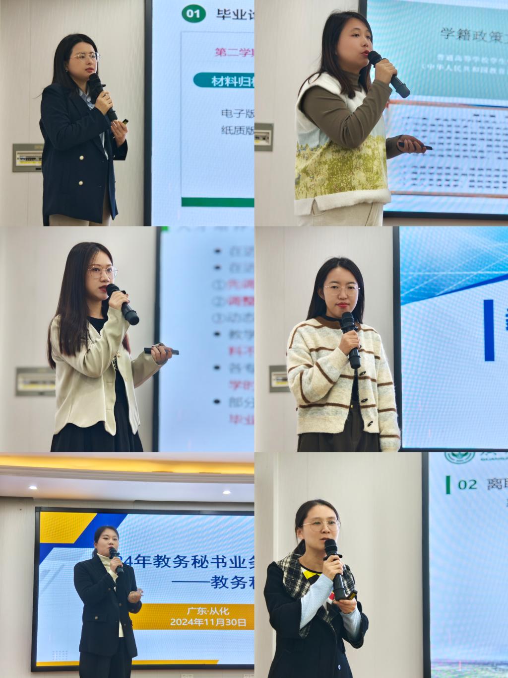 随后,唐美莲副处长以及实践教学科李蕾蕾、学籍学位管理科陈依岚、教学质量监控科饶剑苗、教学研究科赵成云、综合科李英英分别聚焦各科业务,从日常教育教学管理、实践教学管理、毕业设计(论文)管理、学科竞赛管理、学籍管理、专业人才培养方案执行与管理、教学质量监控保障、教育教学研究项目管理以及综合性事务管理等多个方面进行了详细讲解,并系统分享了各自工作中的优秀经验与做法。