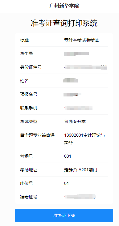 第三步,核对个人信息,无误后点击“准考证下载”即可下载自行打印