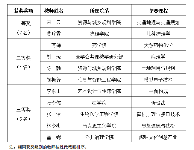 经过院系初赛、校赛网络评审、校赛现场决赛激烈的角逐,资源与城乡规划学院宋云等11名教师荣获奖项,护理学院和资源与城乡规划学院共2个单位荣获优秀组织奖。