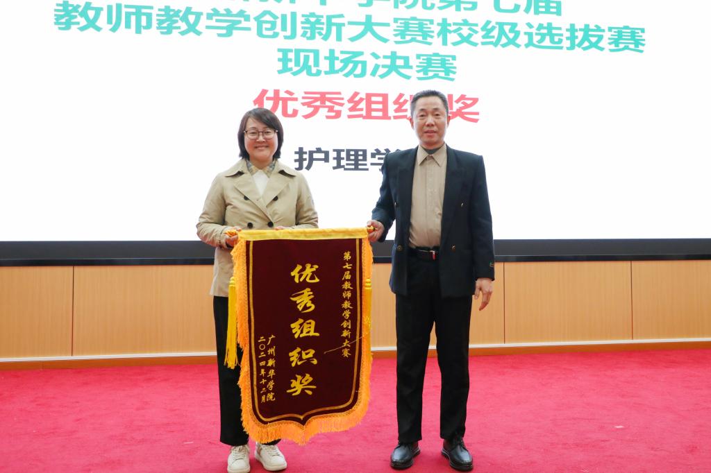 我校教学督导郭奕斌教授(右一)为优秀组织奖单位——护理学院颁发荣誉锦旗
