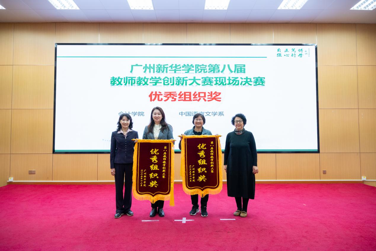 陈小枫副教授(左一)、陈云宏副教授(右一)为优秀组织奖单位颁发荣誉锦旗