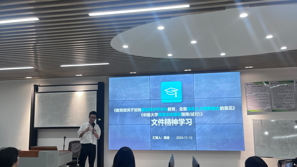 第三部分:黄靖老师带领实验教学中心全体老师学习《教育部关于加快建设高水平本科教育全面提高人才培养能力的意见》、《中国大学质量文化建设指南(试行)》文件的精神。台下的老师们都聚精会神地听并记录,深入学习意见方针,认识到不断提升自我以及培养高质量人才的重要性和必要性。